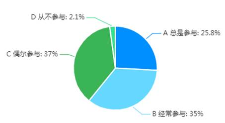 在线教学师生互动良好。关于互动频率,25.8%的学生表示“总是参与”,35%的学生“经常参与”,37%的学生“偶尔参与”,具体情况如图6所示。