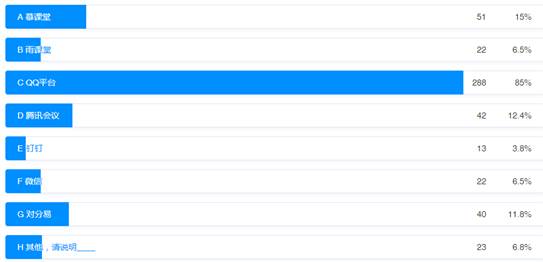 在线教学平台,85%的教师选择了“QQ平台”,15%的教师选择“慕课堂”,11.8%的教师选择“对分易”。可见,QQ平台使用率遥遥领先,以其画面清晰、音质良好、性能稳定等优势,得到了广大教师的青睐,俨然成为团宠。但是专门的智慧教学平台吸引力不足,慕课堂、雨课堂等平台运行的稳定性成为最大障碍。具体情况如图2所示。