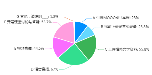 在线教学手段, 67%的教师采用“语音直播”,55.8%的教师“上传相关文字资料”,53.7%的教师“开展课堂讨论与答疑”,44.5%的教师采用“视频直播”, 28%的教师“引进MOOC或共享课”,23.3%的教师“提前上传录音或录像”。教师化身在线主播已成主流,半数以上教师在课堂时间组织了课堂讨论或者针对性的答疑。具体情况如图3所示。