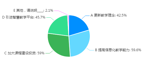 在线教学实施过程中,教师认为需要改进的内容仍然很多,主要包括学校智慧教学投入、课程建设力度、教师教学观念转变、教学能力提升等多个方面。具体来说,59.6%的教师认为需要“提高信息化教学能力”,59%的教师认为需要“加大课程建设投资”,45.7%的教师认为需要“引进智慧教学平台”,42.5%的教师认为需要“更新教学理念”,具体情况如图19所示。