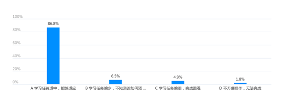 关于学习任务,86.8%的学生认为“学习任务适中,能够适应”,具体如图10所示。