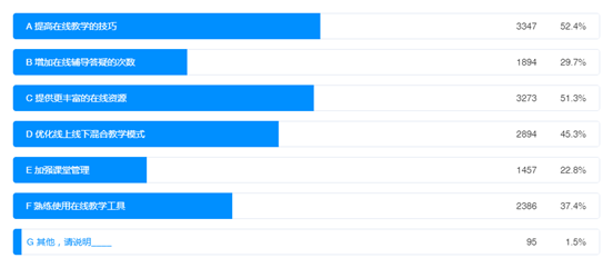 学生调查结果显示,在线教学过程中,教师的教学能力仍然有待提升,教学资源仍有待优化,教学效果仍有进步空间。教师教学能力改进方面,52.4%的学生认为需要“提高在线教学的技巧”,51.3%的学生认为需要“提供更丰富的在线资源”,45.3%的学生认为需要“优化线上线下混合教学模式”,37.4%的学生认为需要“熟练使用在线教学工具”,具体情况如图16所示。