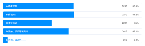 教学资源方面,51.2%的学生认为应该提高“教学ppt”,50.8%的学生认为需要改进和提升“慕课资源”,47.2%的学生认为需要改进“课前、课后导学资料”,35%的学生希望改进“作业形式”,具体情况如图17所示。