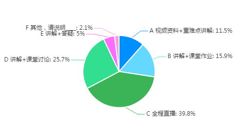 在线教学组织形式,39.8%的教师“全程直播”,25.7%的教师采用“讲解+课堂讨论”,15.9%的教师采用“讲解+课堂作业”,11.5%的教师采用“视频资料+重难点讲解”,5%的教师采用“讲解+答疑”,具体情况如图4所示。