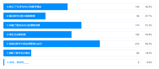 与去年比较,在线教学有诸多改进,极大地推动了课堂教学改革。63.4%的教师认为“信息化教学手段应用更得心应手”,51.3%的教师“构建了更适合自己的课程资源”,44.8%的教师认为“师生互动更和谐”,42.2%的教师“树立了‘以学为中心’的教学理念”,27.7%的教师“强化教学过程大数据管理”,18.3%的教师“创新了教学设计模式”,具体情况如图14所示。