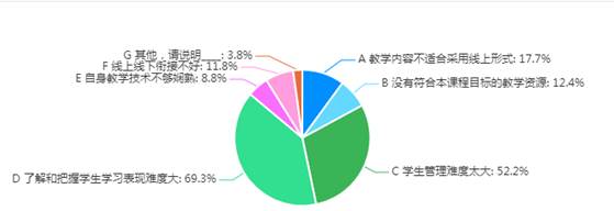 但是,在线教学依然未能达到完美效果。教师调查结果显示, 69.3%的教师认为“了解和把握学生学习表现难度大”,52.2%的教师认为“学生管理难度太大”,17.7%的教师认为“教学内容不适合采用线上形式”,12.4%的教师认为“没有符合本课程目标的教学资源”, 11.8%的教师认为“线上线下衔接不好”,8.8%的教师认为“自身教学技术不够娴熟”,具体情况如图15所示。