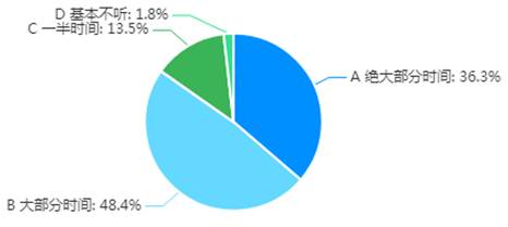 关于学生在线课堂学习情况,84.7%的学生能够积极投入学习,具体投入学习时间比例如图9所示。