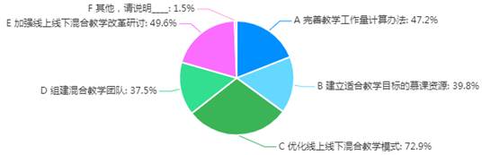 为更好推进线上线下混合教学,72.9%的教师认为需要“优化线上线下混合教学模式”,49.6%的教师认为需要“加强线上线下混合教学改革研讨”,47.2%的教师认为需要“完善教学工作量计算办法”,39.8%的教师认为需要“建立适合教学目标的慕课资源”,37.5%的教师认为需要“组建混合教学团队”,具体情况如图20所示。