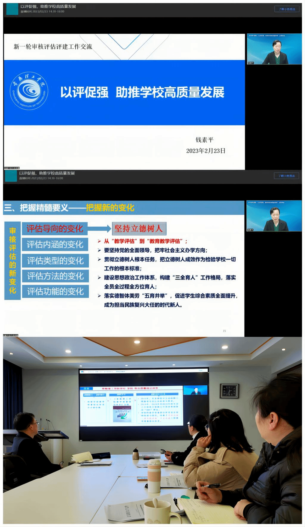 钱素平结合学校评估工作详细分享了“学校申请、自评自建、线上评估、入校评估”四个阶段的实施过程;根据本科教育教学审核评估指标体系,强调把握新变化、把握重点要求;阐述通过评建进程、组织保障、统筹协调、宣传发动、自评自建、技术保障等做好顶层设计,做好新一轮审核评估以促进学校教育教学高质量发展。